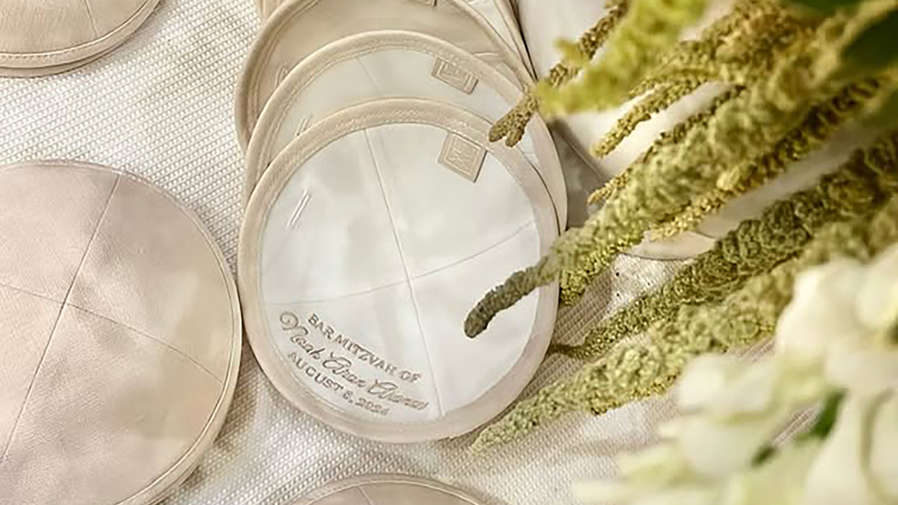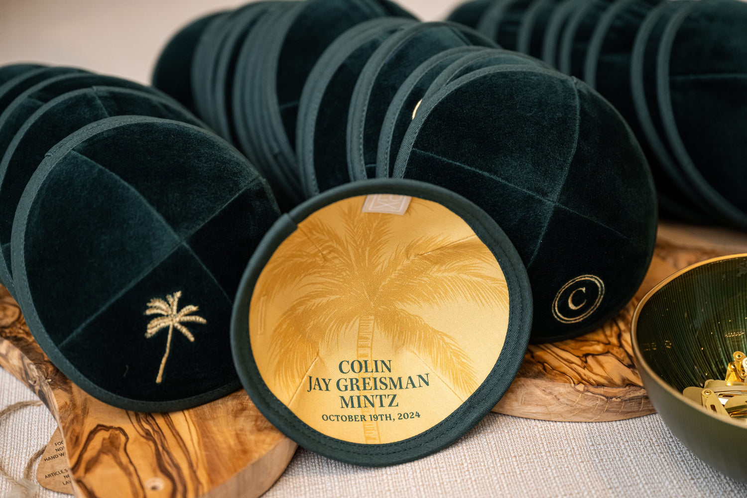 The information you want inscribed on your product (Name/Date/Hebrew writing), Logo (if you have one for your event), how many pieces you need made, what are the customizations you would (Embroidery, Custom Lining, Fabric type, Trim etc)